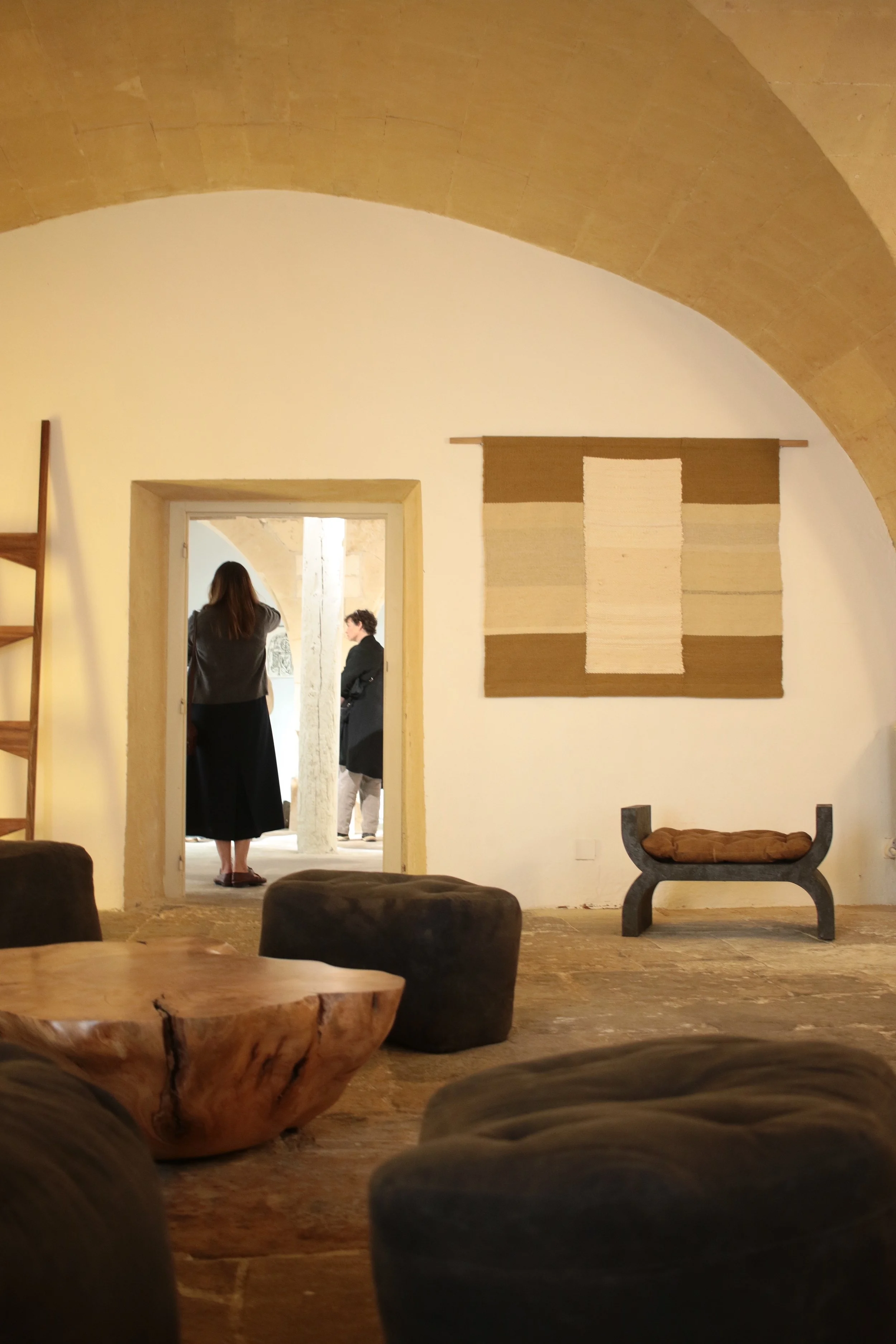 Last collective exhibition at Vague, Teruhiro Yanagihara’s Studio in Arles, gathered by La Lune Galerie in May 2025, was composed of raw matter and precise, folk inspired forms. An original triptych woven out of wool and ancient bed linen, recalls for primary forms and techniques.